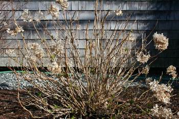 There is no advantage to pruning in the fall because you will have to prune again in the spring anyway. Why? Because parts of the plant will be damaged or killed by winter weather and these parts have to be removed. So you might as well do all pruning at one time. Now I originally thought hydrangeas were the easiest of all plants to prune because you can cut to them any height and there is no “shape” to worry about. I soon found out that it is quite the opposite and while I prune the plants with loving care each spring I struggle and swear while I am working. The reason they are so hard to work on is two-fold: when you remove dead branches you have to cut them at ground level and when you work around the budding stems you knock off the buds!