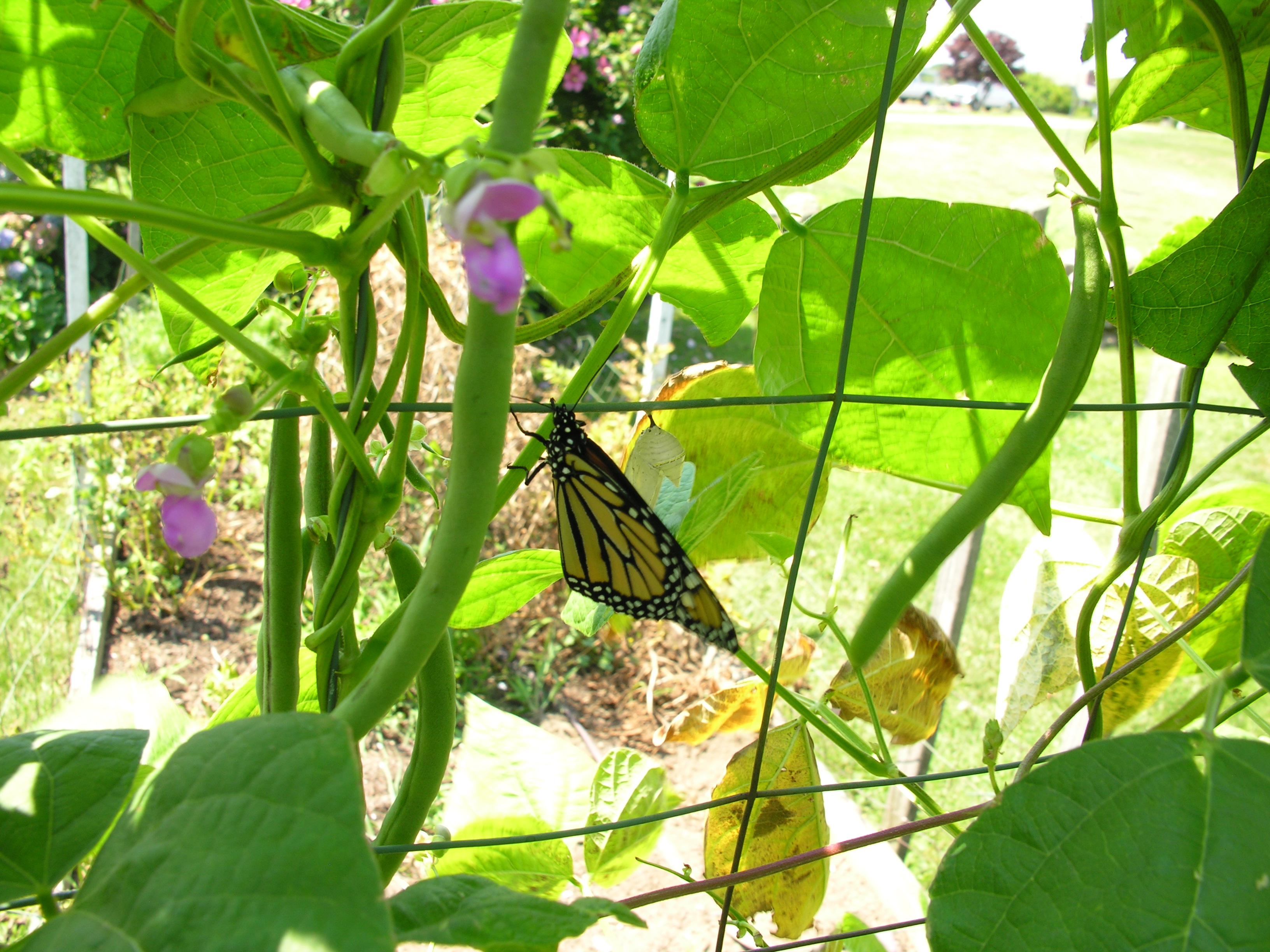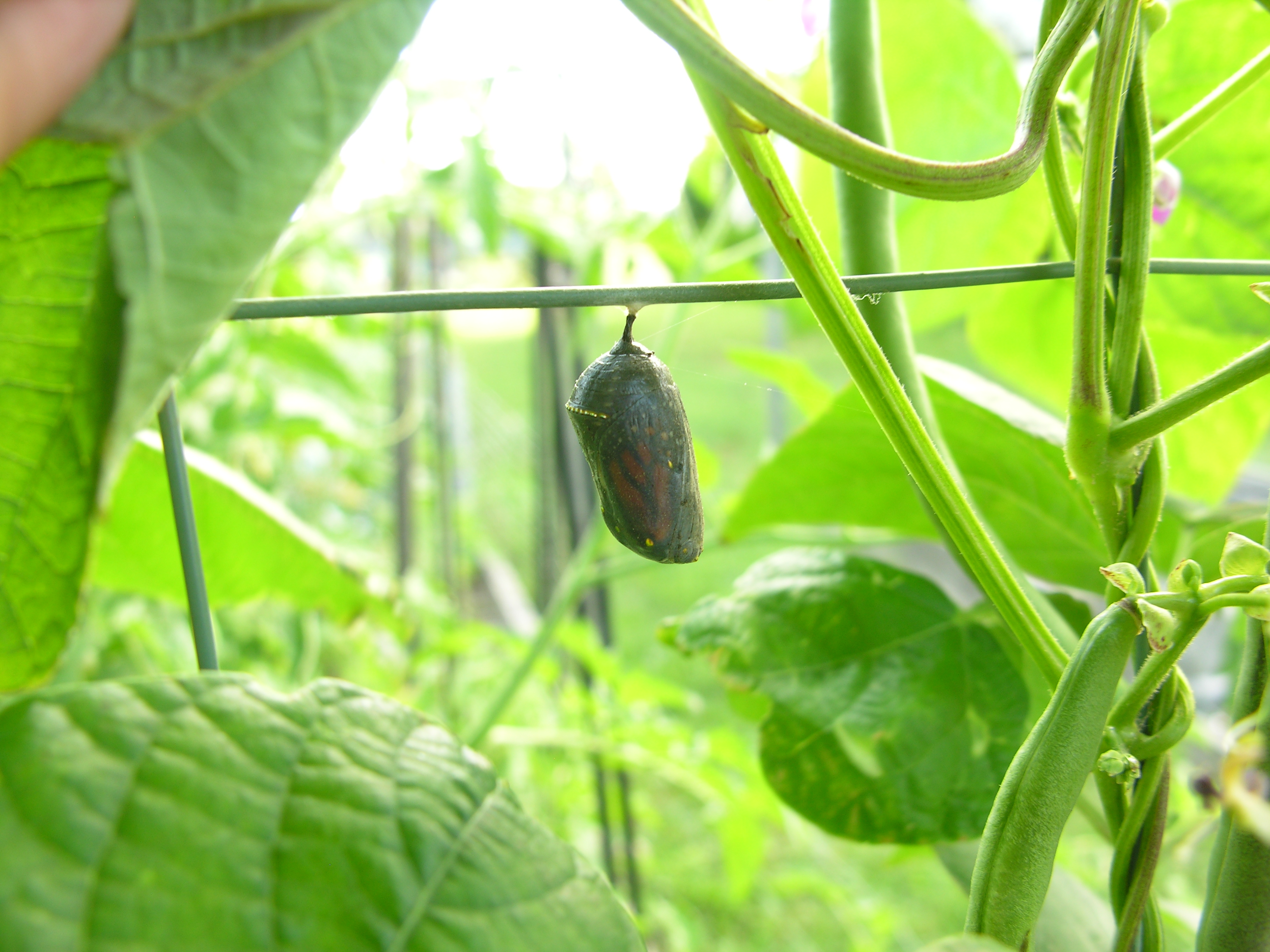 Recently, I told you about the monarch caterpillar that had pupated among my string beans. I considered myself lucky to have found the chrysalis, but did not dare hope to catch the emergence of the butterfly.