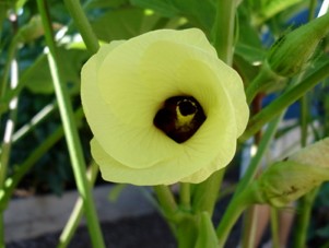 I was about to pull the plants out and plant something else, when I noticed the beautiful okra flowers on the plant stalks. To me, okra is not a pretty vegetable. It can’t compare to the beauty of a shiny deep purple “Black Beauty” eggplant or a big red “Brandywine” tomato. Okra pods are ridged, and a matte, nondescript green color, but the flower is absolutely beautiful. The soft, pale yellow color of the petals provides a spectacular off-set to the deep maroon color inside the flower, which is spectacular. What I found really amazing is that when the flower falls off the plant, a fully formed and almost full-sized okra pod remains in place, waiting to be picked.