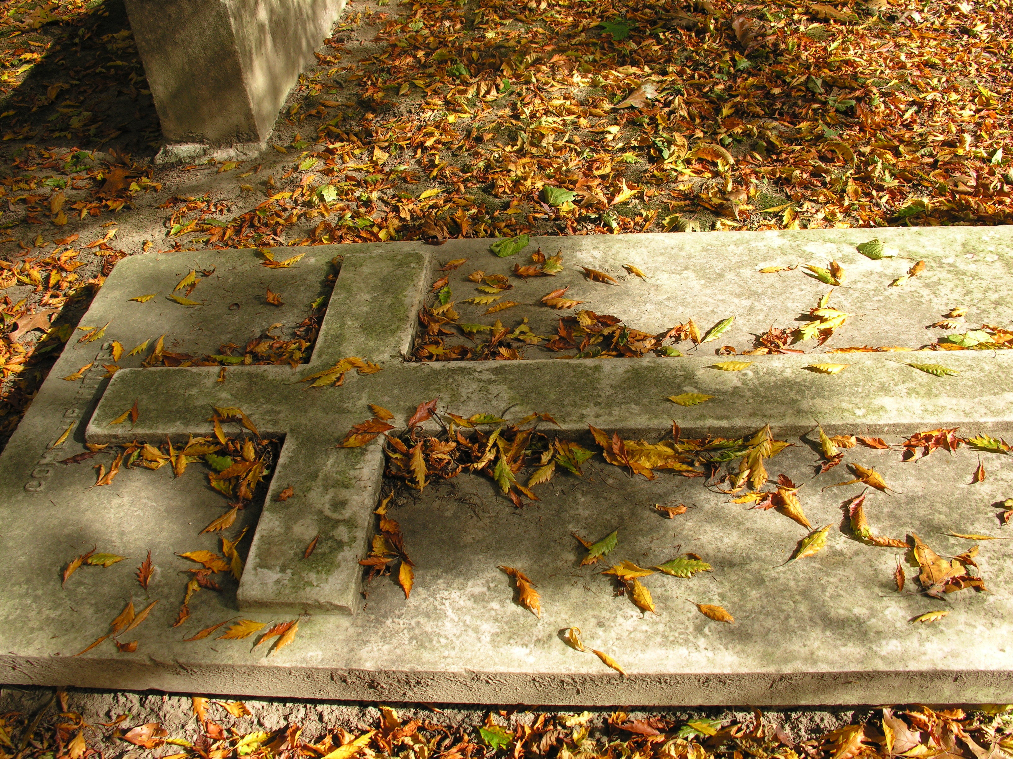 Several gravestones rest under the canopy, quietly collecting the falling leaves.