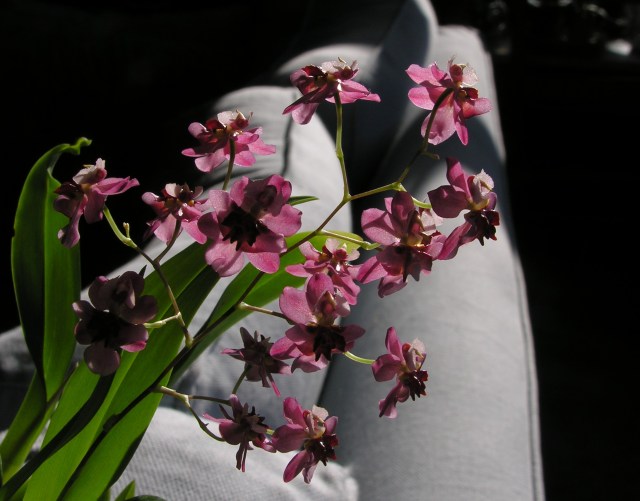 This is Oncidium Twinkle “Pink Profusion.” I have only had it for about six months, but it seems to be a cheery and undemanding plant. When I bought it, it was in spike, and now it is blooming again, sending up a thin spike with many delicate two toned pink flowers. It is fragrant, too, but I find the scent a bit funky.