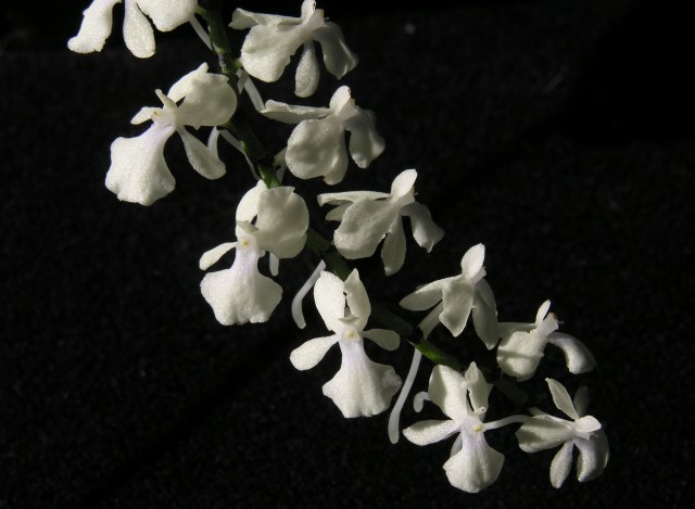 These small orchids, native to Madagascar, are supposed to do much better when mounted on a tree fern or cork bark, and not so well in a pot. They are also said to prefer shade to sun. Well, mine has been in a pot since I bought it, and it seems very happy. I also keep it in a sunny window, although I do move it to a shadier spot when the sun is very strong in the summer. The keys to success appear to be bright light, cooler temperatures, high humidity and good air circulation – with air circulation being key. I water mine weekly and set the pot on gravel in a tray, but I don’t keep the gravel wet.