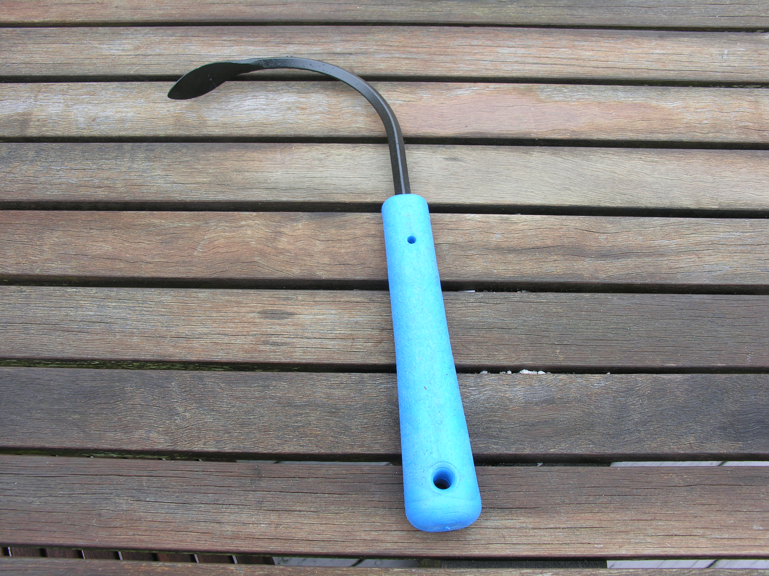 This is a new tool to me. The bright blue handle is appealing since I spend a lot of time looking for green-handled tools. Tying a red ribbon on the tools helps me locate them. It would make sense to just go ahead and paint them red.