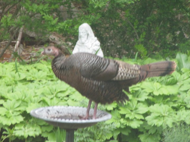 Turkey alert! Spotted three hens with 7 babies in the yard this afternoon….very fuzzy and tiny, and certainly not big enough to get in the birdbath yet. Just too slow with the camera though.