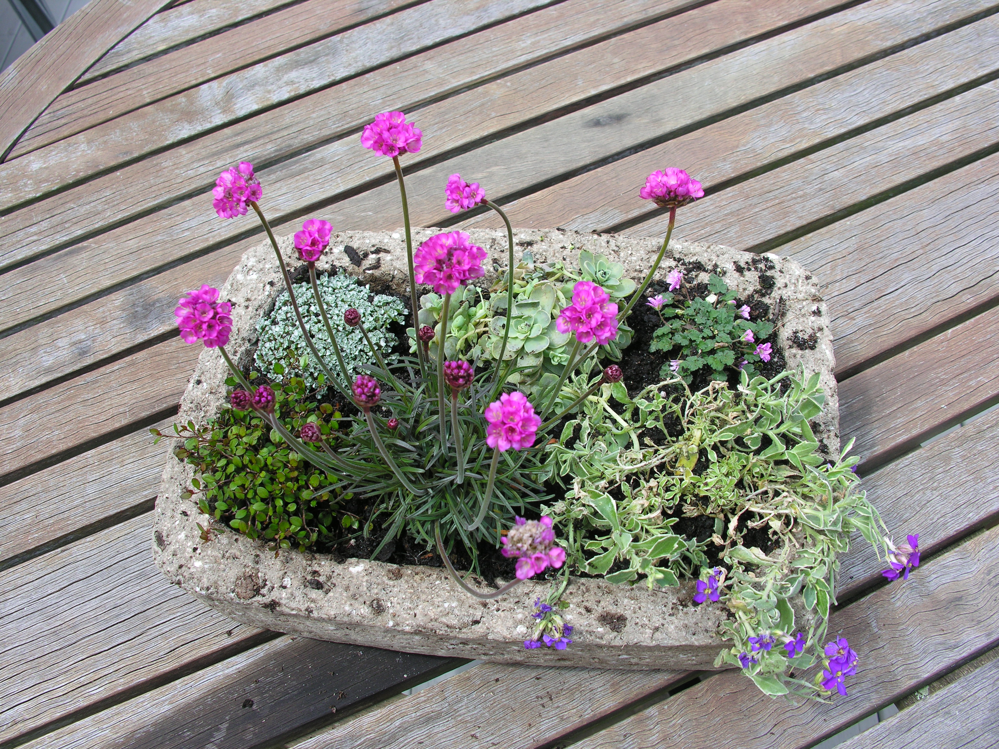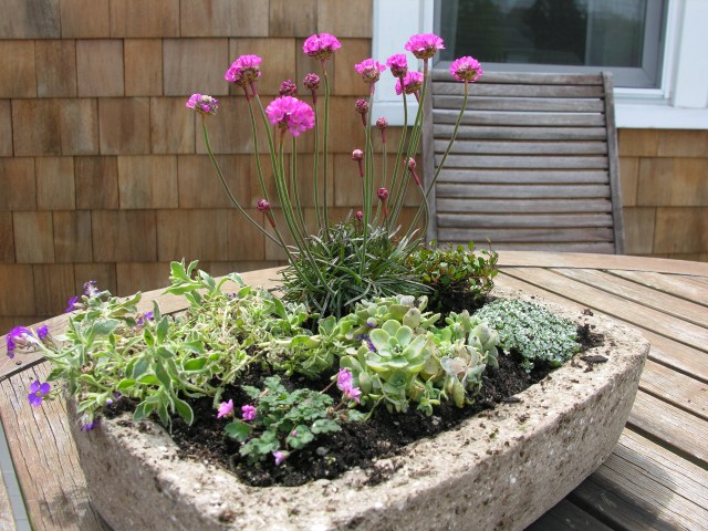 The creation in the above photo is my gift to her this year. Instead of buying something ready made, I went to my favorite nursery for inspiration. I bought a rectangular hypertufa and several plants from their extensive and irresistible alpine collection.