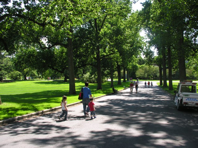 Families enjoying a stroll along the allee of tulip poplars. New Yorkers seem to love their botanical garden and treat it with respect.