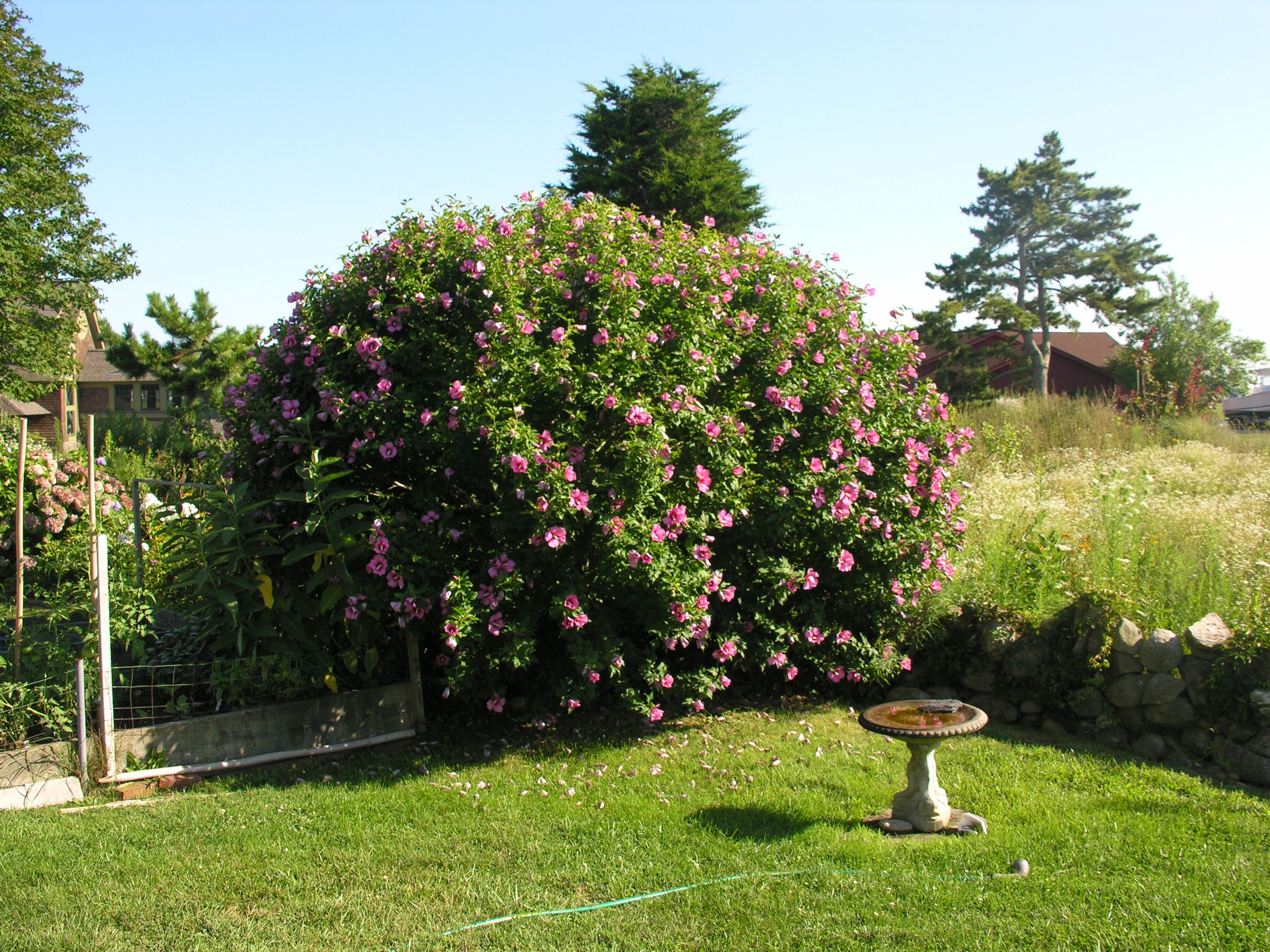 This is my neighbor’s hibiscus. These are not the ones you buy for indoor growing – the ones that almost always succumb to spider mites. This shrub is also known as “Rose of Sharon” here in New England. Like everything else, they are in flower early this year. Deer don’t like eating them – another reason for their popularity here.