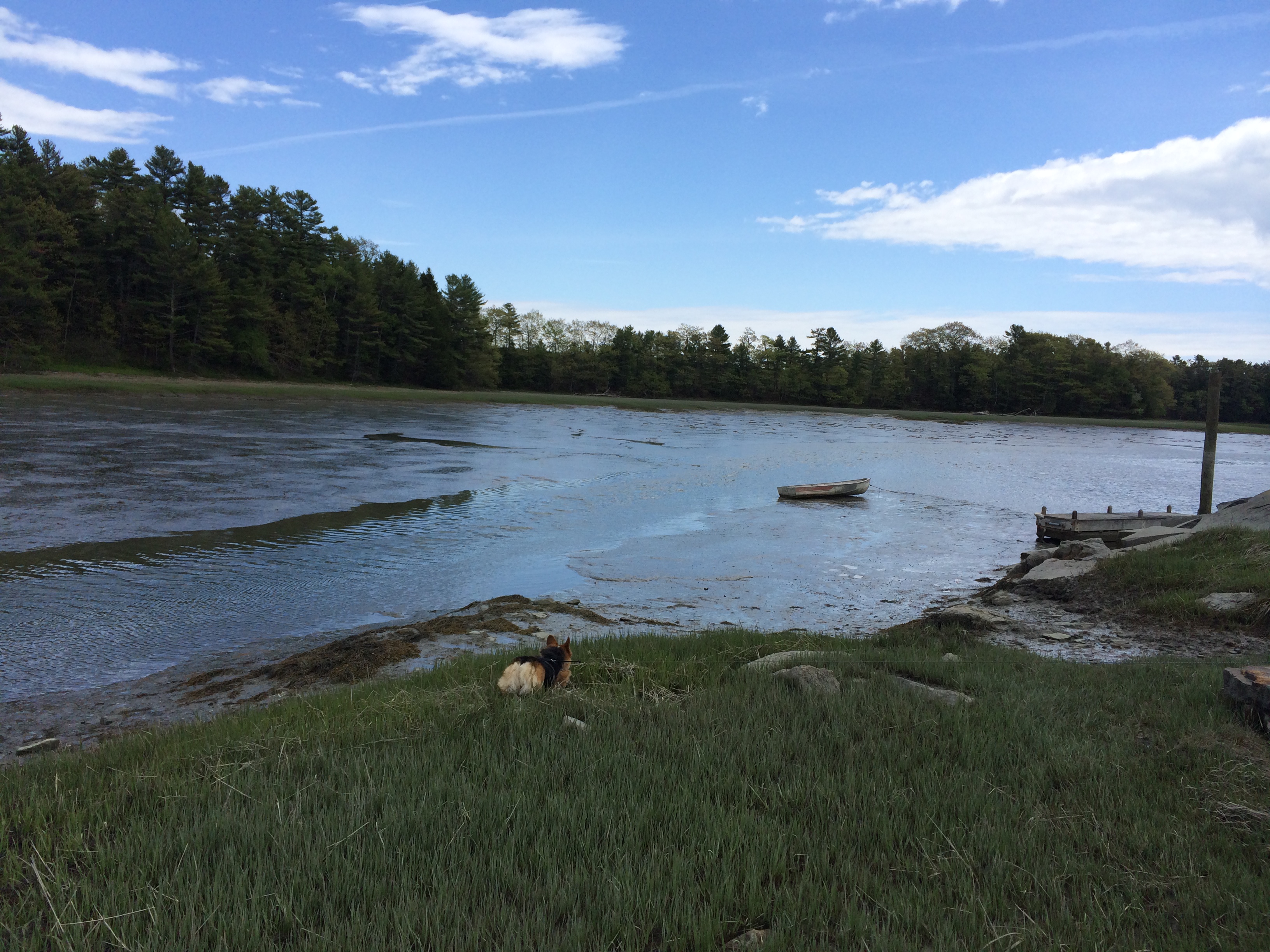 Speaking of tidal range, we walked our dog down to the shore at low tide, and she sank up to her elbows in stinky muck, which stayed on her paws when she got back in the car. Here she is, heading for the mud. Such are the joys of traveling with dogs.