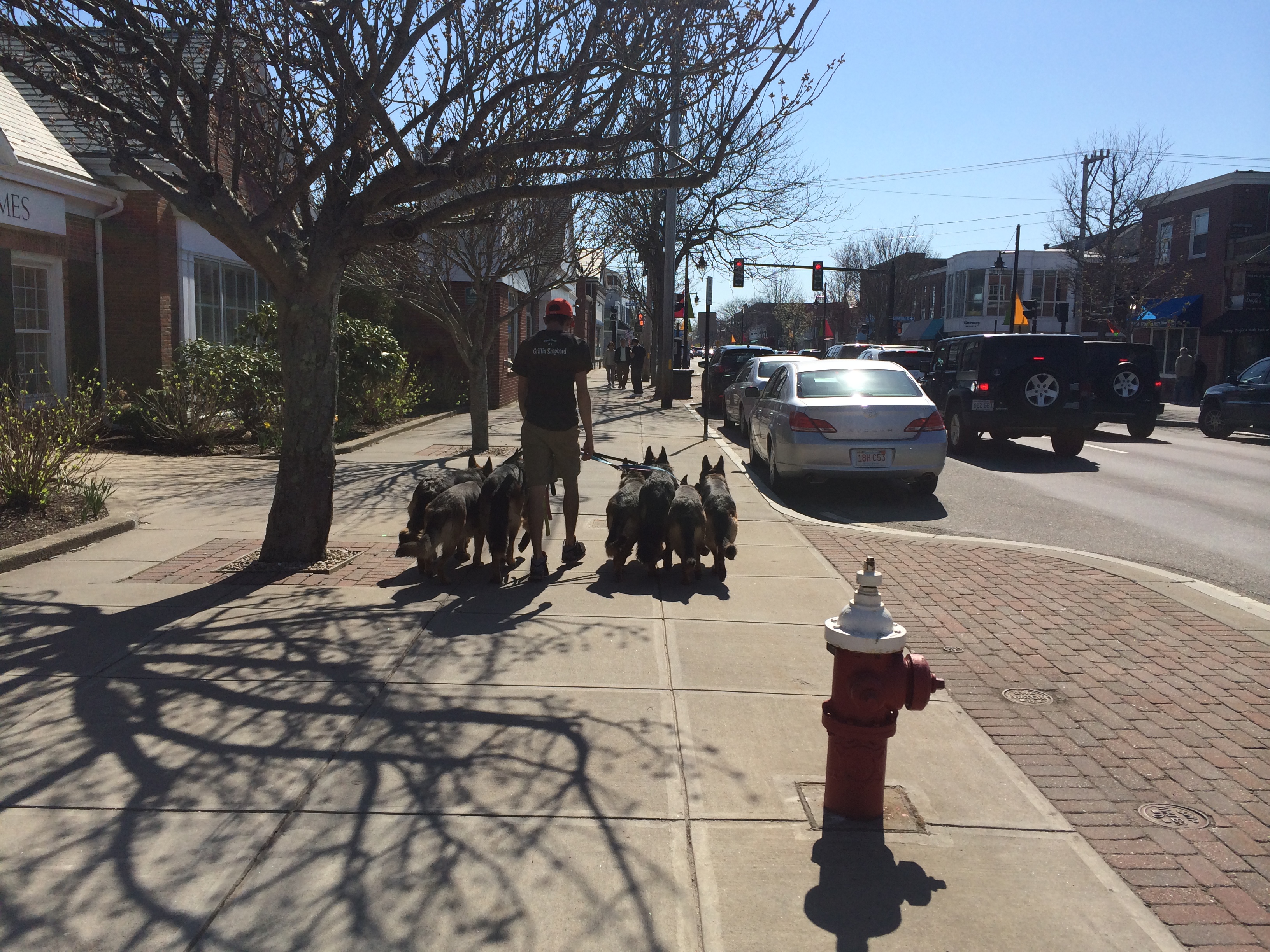 I saw a man walking down a street in Hyannis, Cape Cod, with what looked like five dogs. They were all perfectly behaved and seemed to walk in sync, almost like doggie Rockettes.