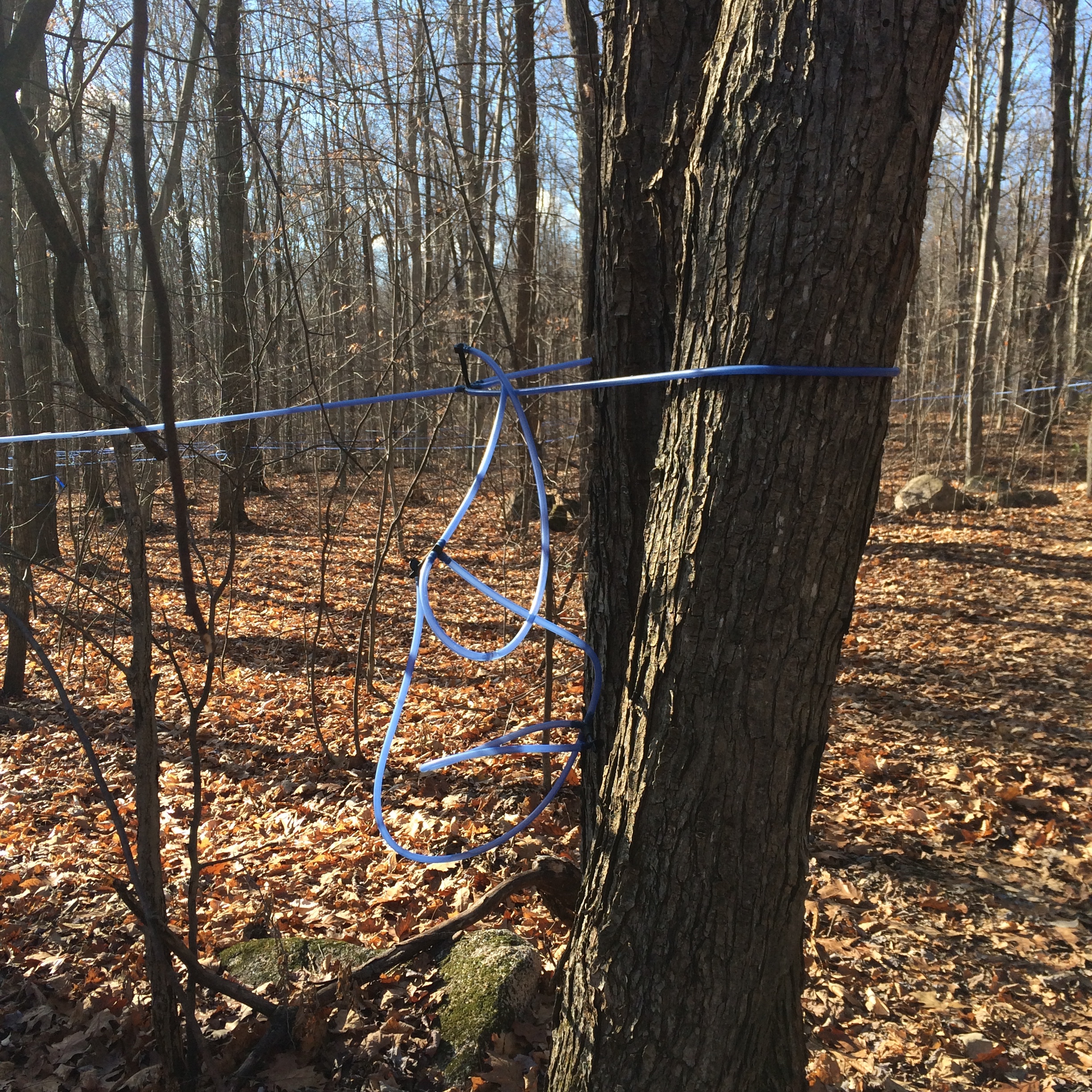 IMG_3029Some of the maples were also tapped for sap. Tubing is the preferred method when you have a large sugar bush. It’s kind of a pain when the squirrels chew it up though.