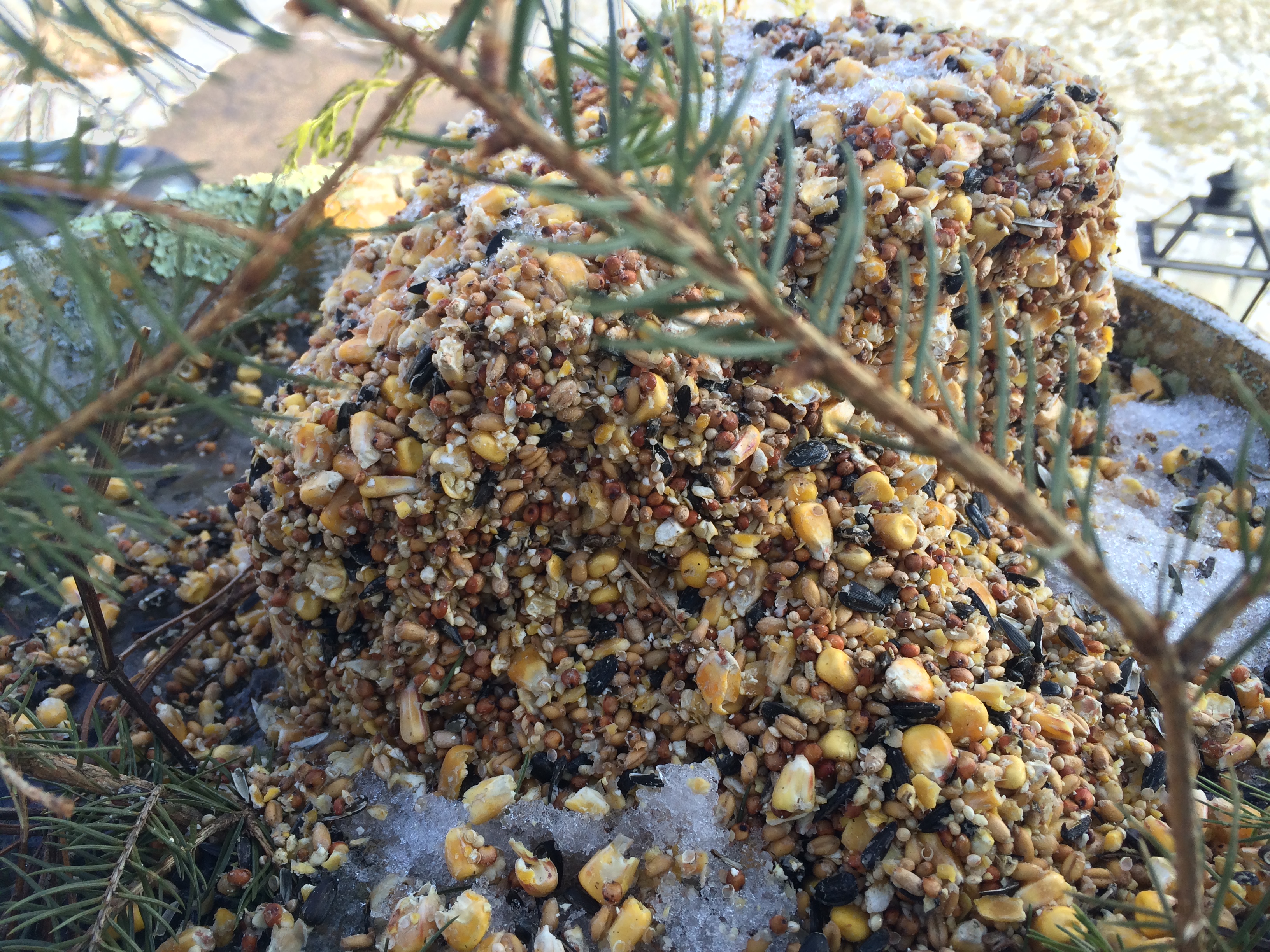 In addition to black oil sunflower seed, that universally beloved bird food, I have added a wildlife block, and a mix called “Critter Cuisine” that contains various seeds with corn, pumpkin seeds and peanuts in the shell. Here’s a close-up of the mix: (Notice the peanuts are gone. They’re always gobbled up first.)