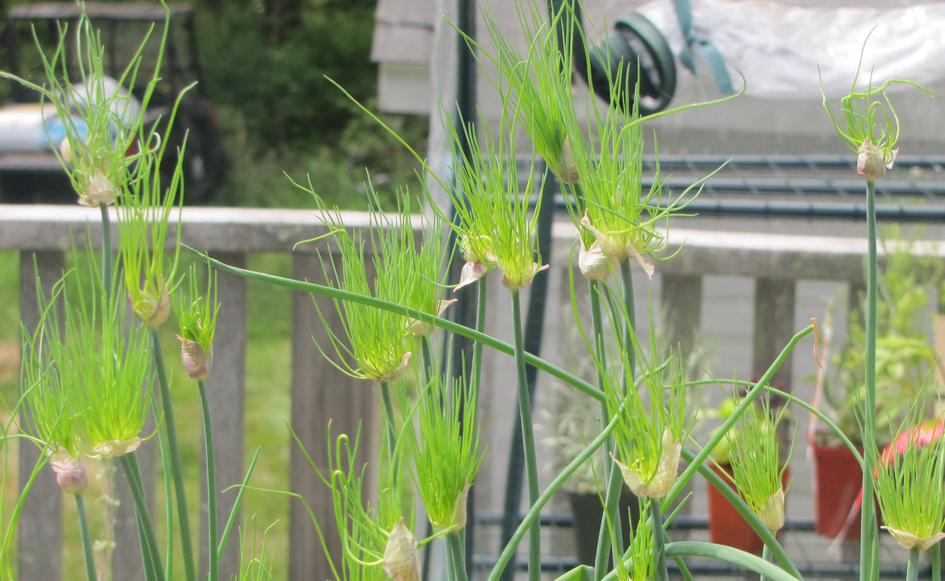 2. Found ‘Cha Cha” chive on Burpee’s plant offerings, and subsequently did some research trying to find out what species of Allium it really is. Based on the hollow stems and leaves (round in cross section), it most certainly is not Allium tuberosum, the commonly cultivated “garlic chives” with white flowers (although not really a true chive, true chives are “Allium schoenoprasum”). Most likely this is a selection of Allium vineale, the Crow Garlic, an invasive non-native, considered a noxious weed in most US States. It is common for some Allium species to produce little “bulbils” in the flower head that sprout leaves, the bulbils dropping off and starting new plants (thus their invasive nature). The percentage of bulbils to flowers varies depending on selection, there can be both flowers and bulbils, other times all bulbils without any true flowers. I will order a plant or two from Burpee to verify my diagnosis.