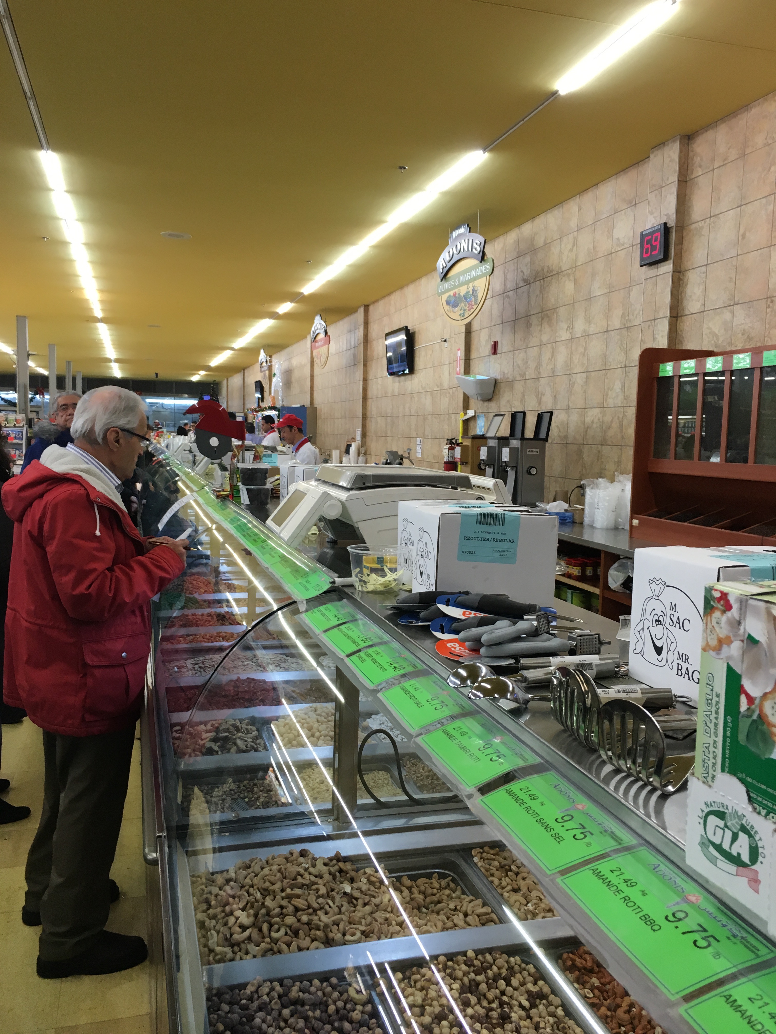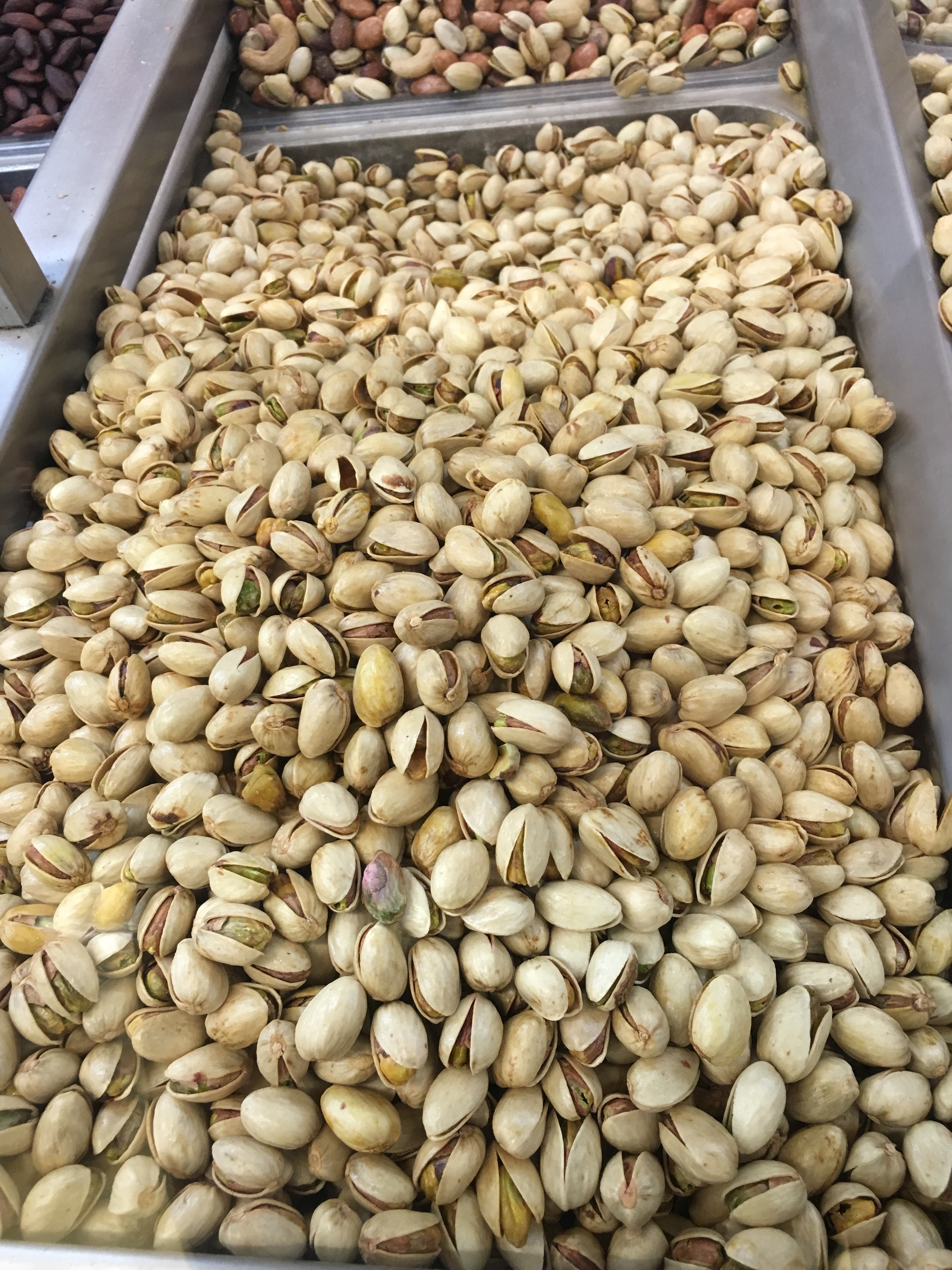 We made our way to the endless nut counter, where there is a mind-boggling selection and the nuts are always fresh. Not expensive, either.