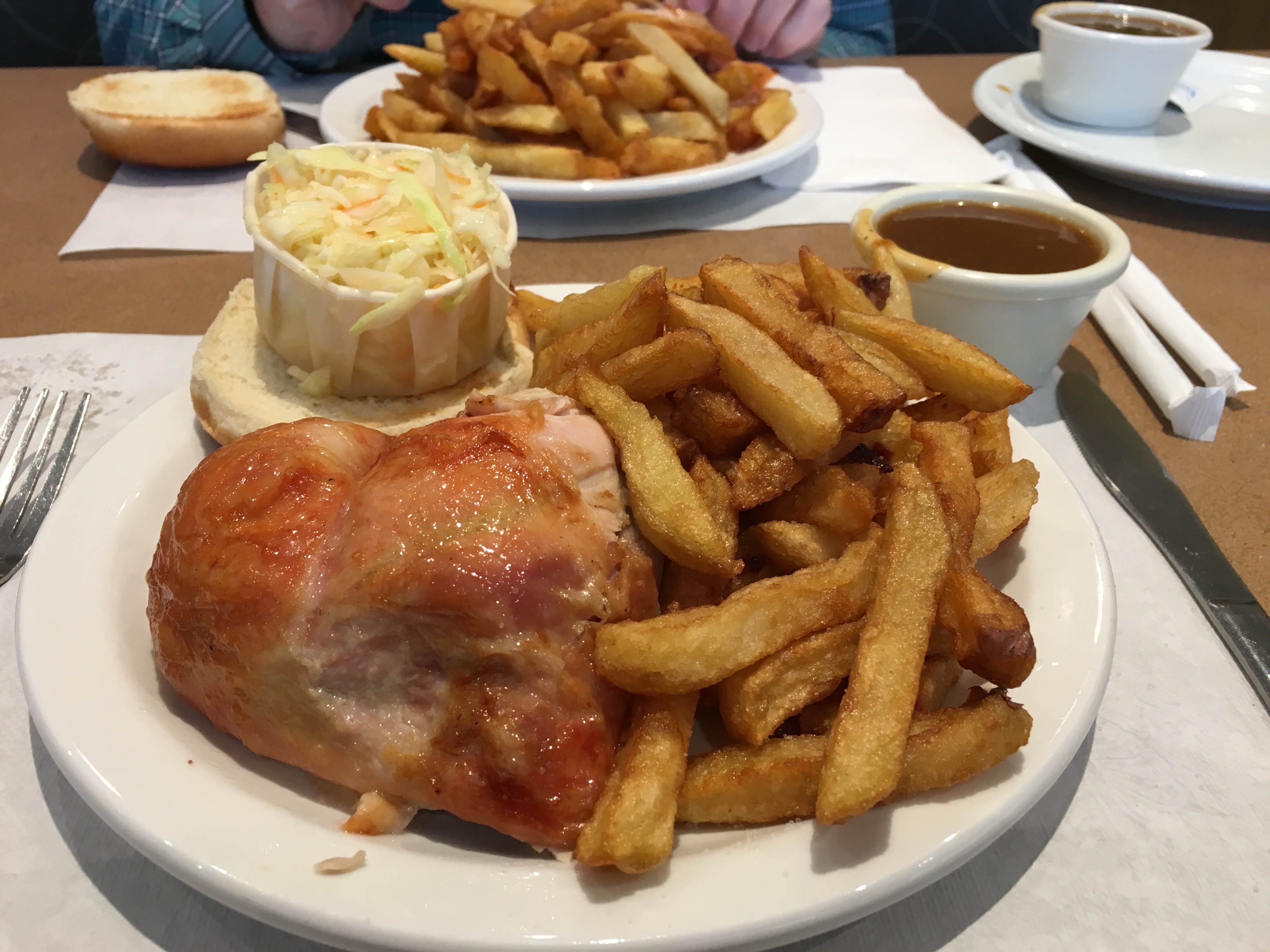 Before driving back to my sister’s, we stopped for lunch at a favorite restaurant: Cote St. Luc BBQ. This is not barbecue in the traditional American sense. The most popular meal, pictured above, consists of what Americans call rotisserie chicken (but a million times better), killer fries made from scratch, cole slaw, a bun, and classic Quebec-style sauce for dipping everything in. This plate has what is called a “dark quarter,” but you can also get white meat – which I would never do for this meal, but whatever…