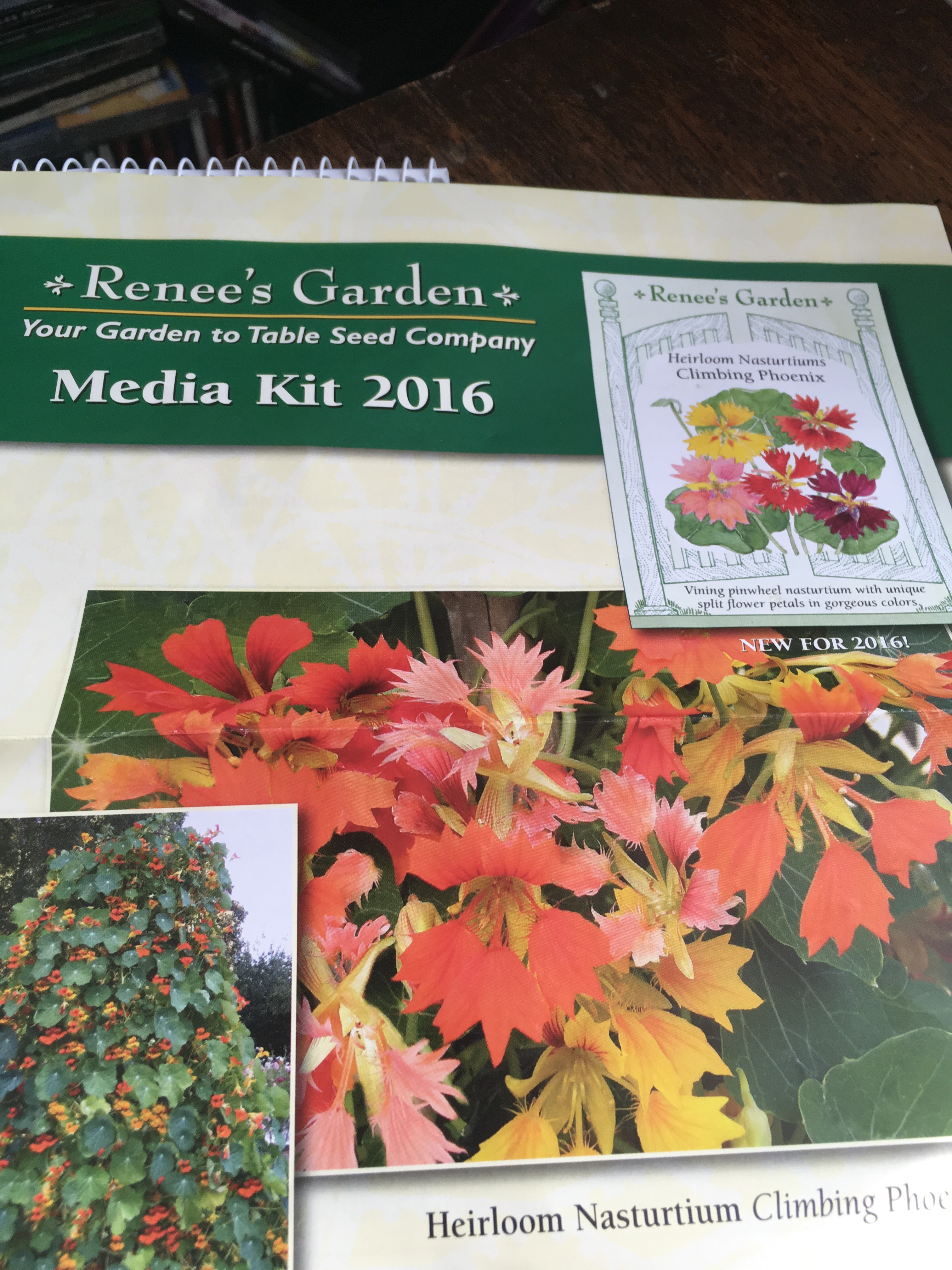 I received this media kit this week from Renee’s Garden. It included a sample packet of the featured annual: “Climbing Phoenix” heirloom nasturtiums. I don’t think I have ever seen these before, and they look interesting. I will plant them in a large container where I grew Thunbergia so successfully last year.