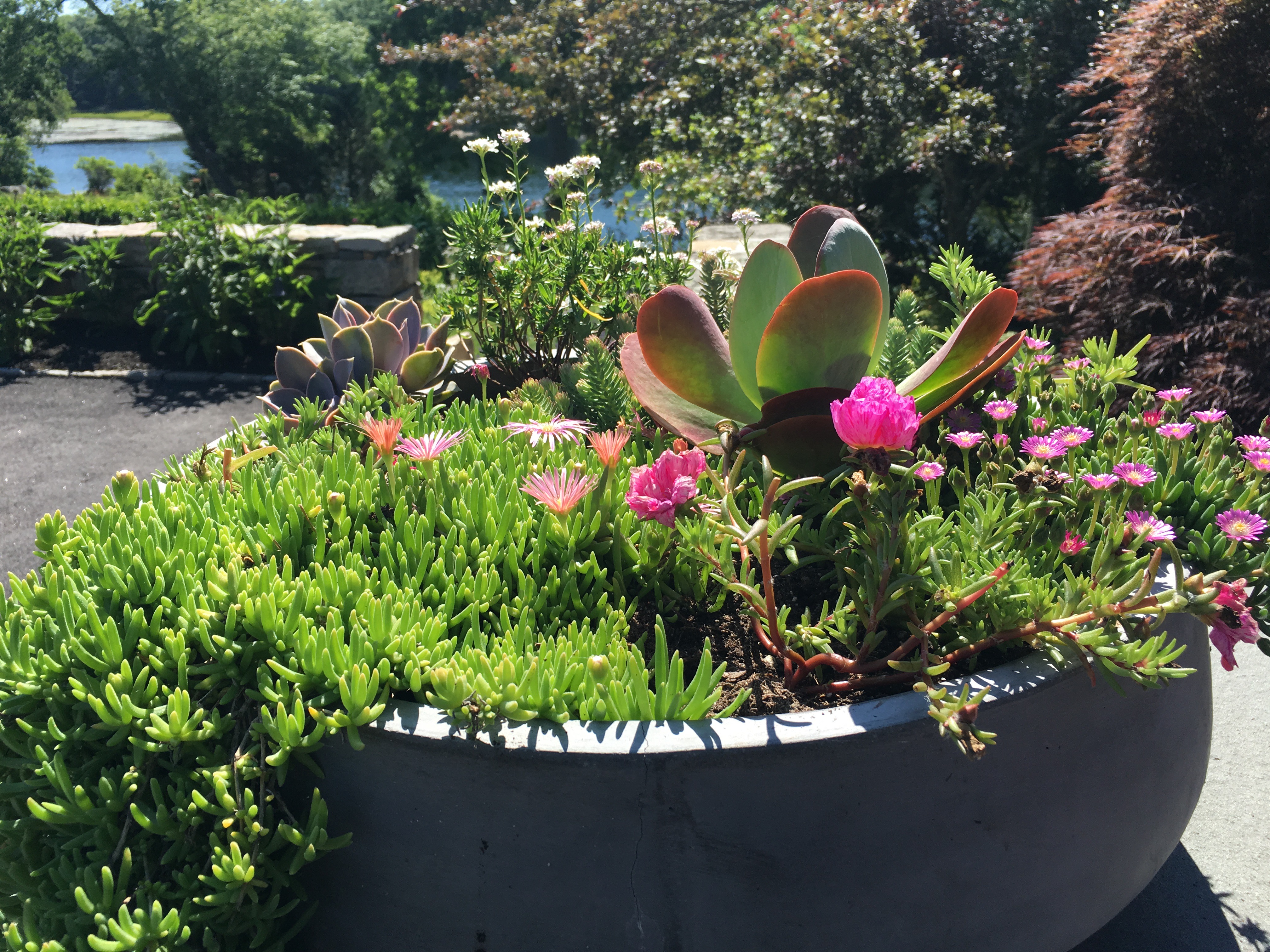 This post is in response to a request from a reader who wanted to see more containers from the garden I wrote about last week. You ask, Micky, I deliver. The above container, in a hot, sunny spot, was appropriately planted with succulents and portulaca.