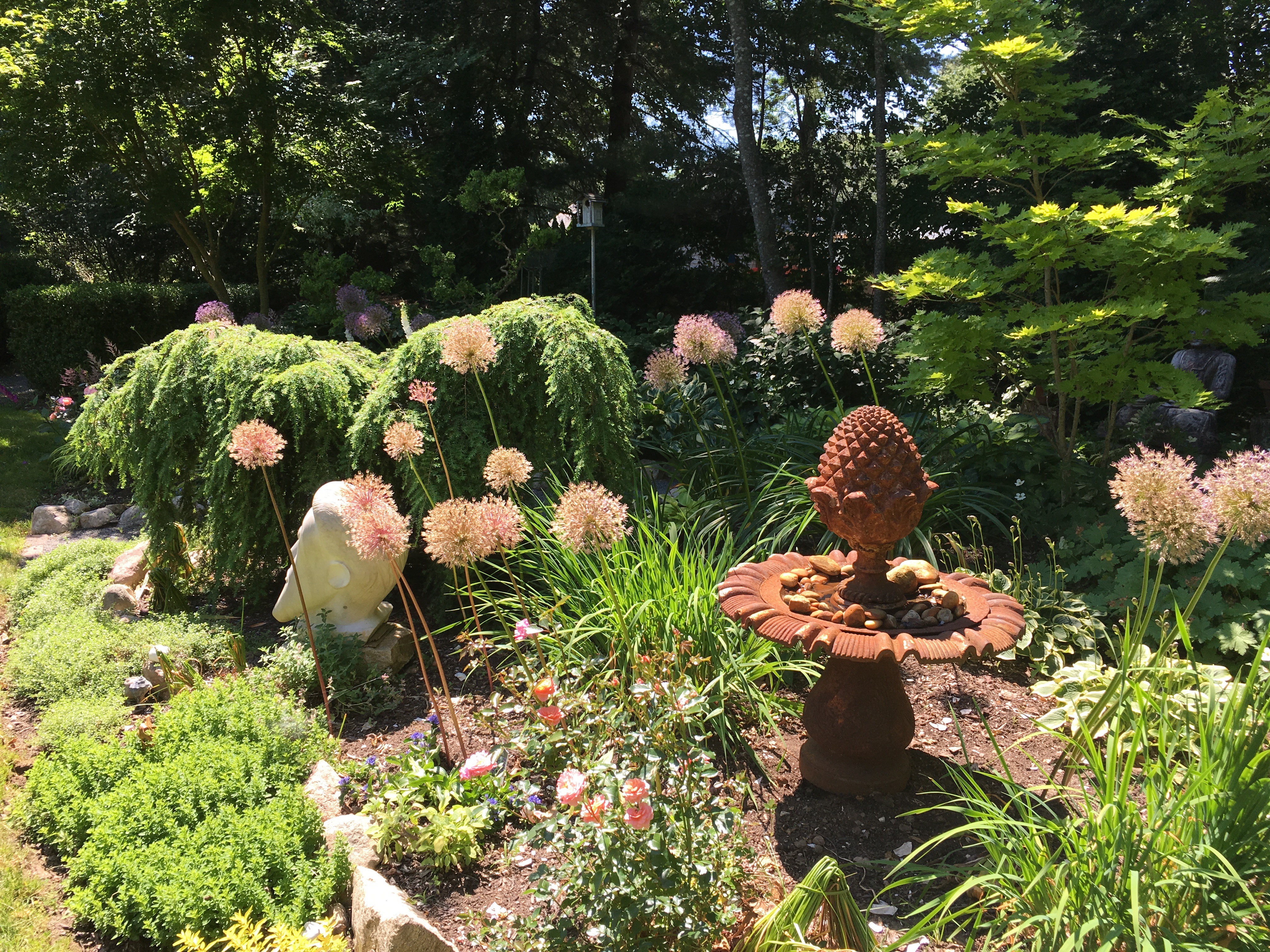 This is the second garden we visited during the recent Gardens by the Sea garden tour in Charlestown, RI. This garden was skillfully designed, beautifully planted and full of funny surprises – both colorful and sculptural. I love alliums just as much after they have bloomed. They look great in this setting.