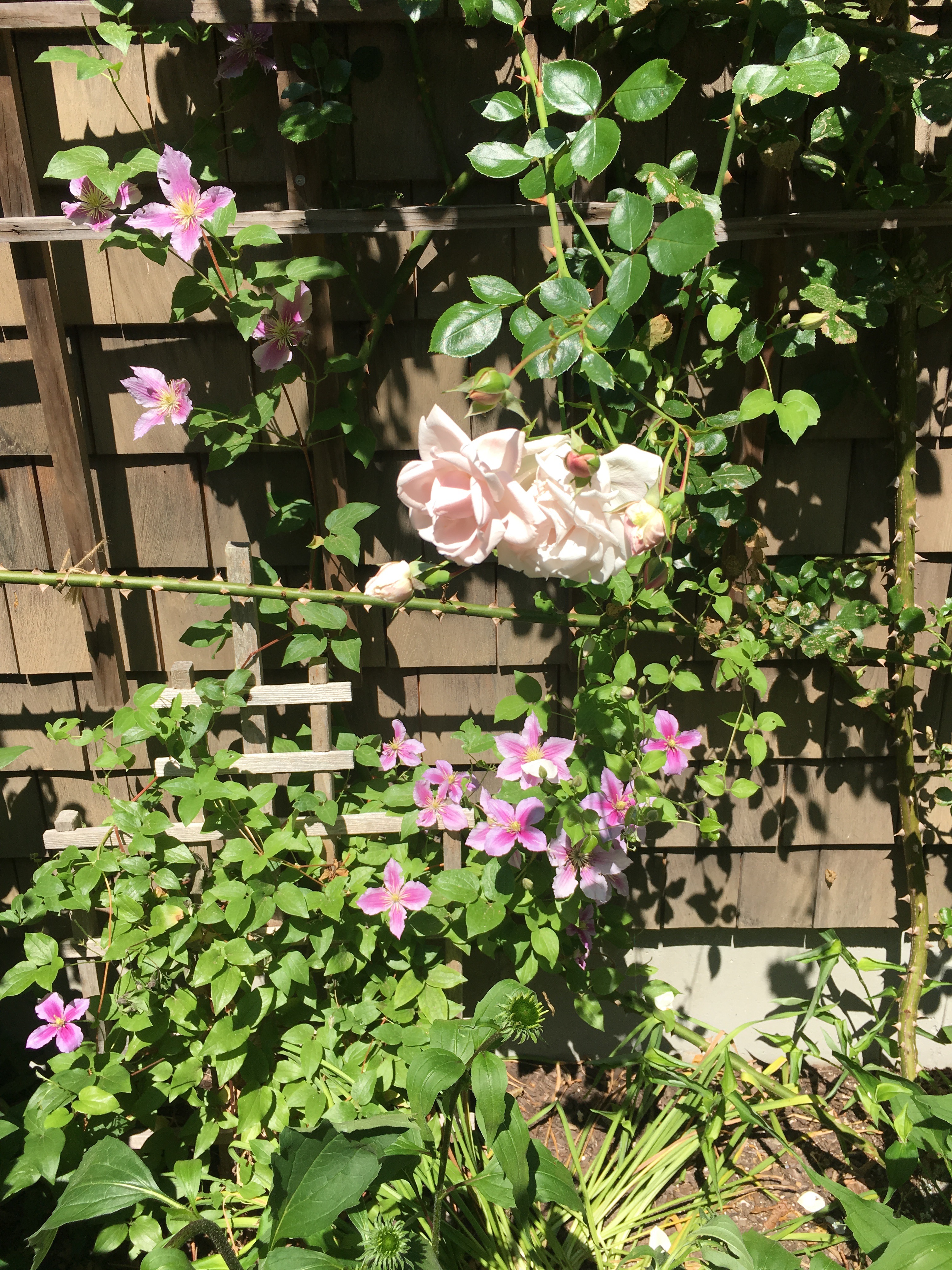 A “New Dawn” rose planted with clematis, covered one wall.
