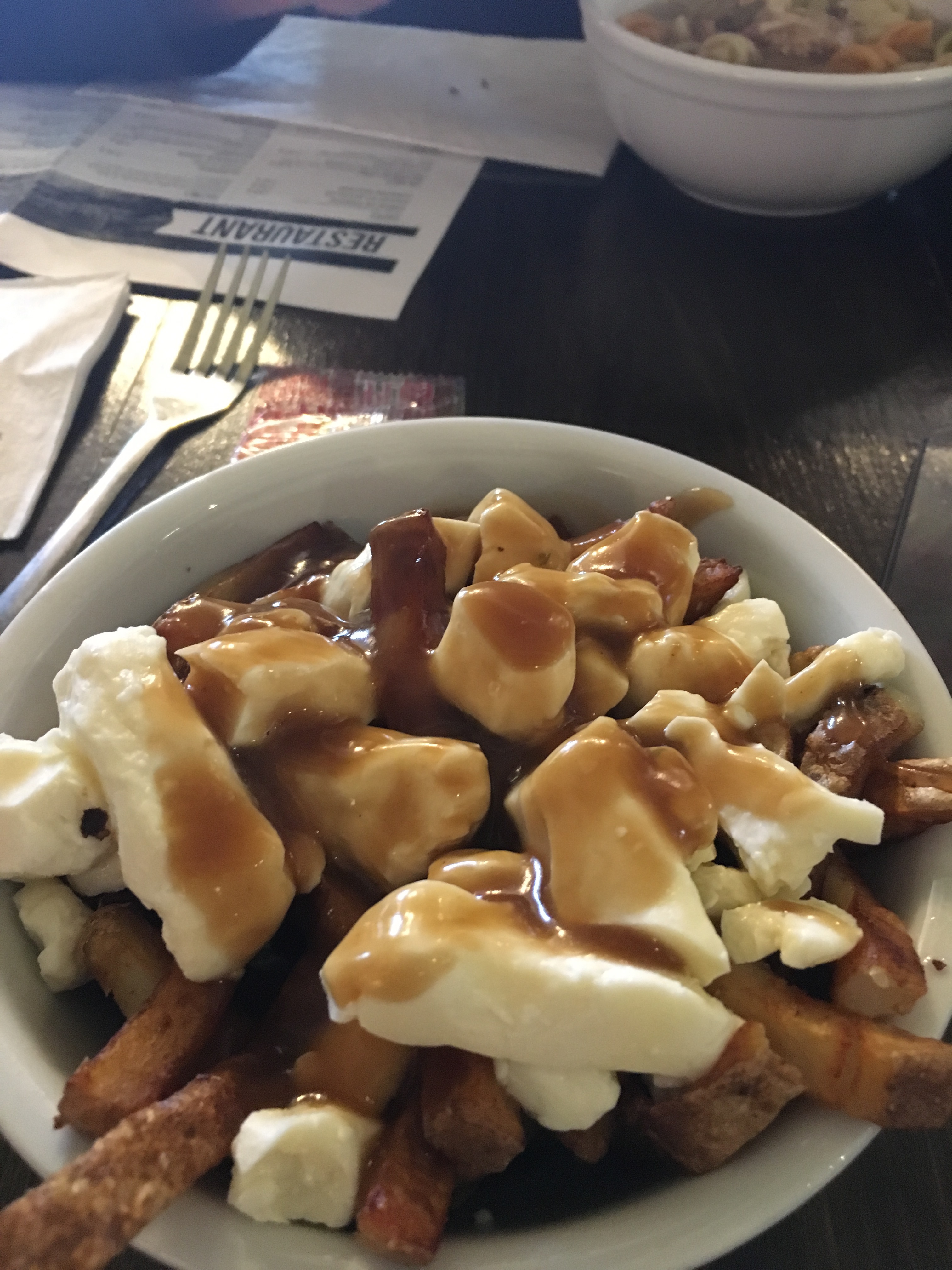 The above photo shows a favorite Quebec food: the iconic poutine. For those of you unfamiliar with this dish, it consists of just three ingredients: french fries, cheese curds, and brown gravy. Because there are so few components, each one must be perfect. The fries have to be thoroughly cooked, the gravy can’t be too spicy, and the cheese curds must be fresh, with a slightly squeaky texture when you bite into them.