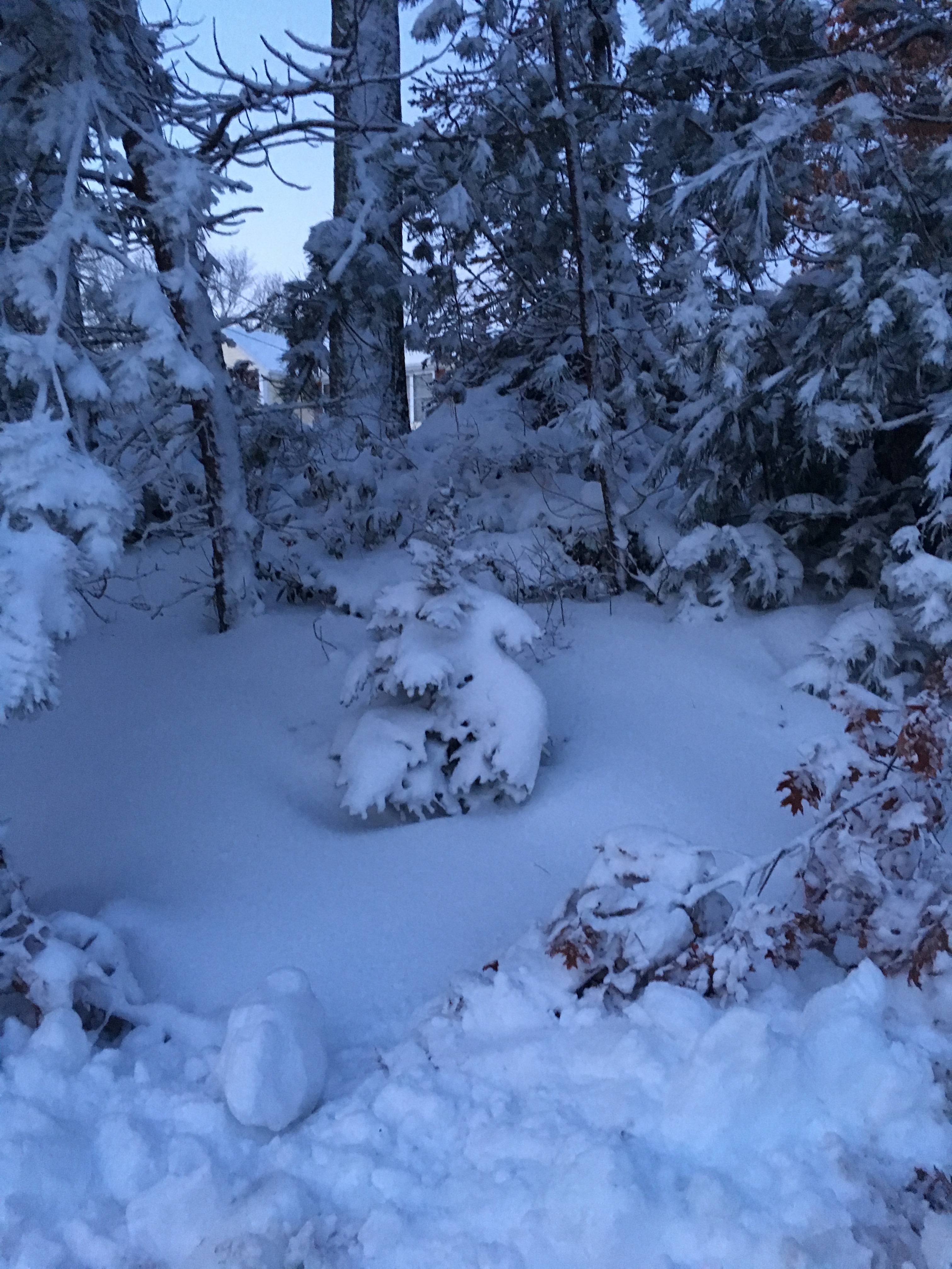 I took this photo near our house the morning after last Thursday’s storm. It’s blue-ish because the sun hadn’t risen yet. That white mound in the center of the frame is a spruce, covered in snow and ice.