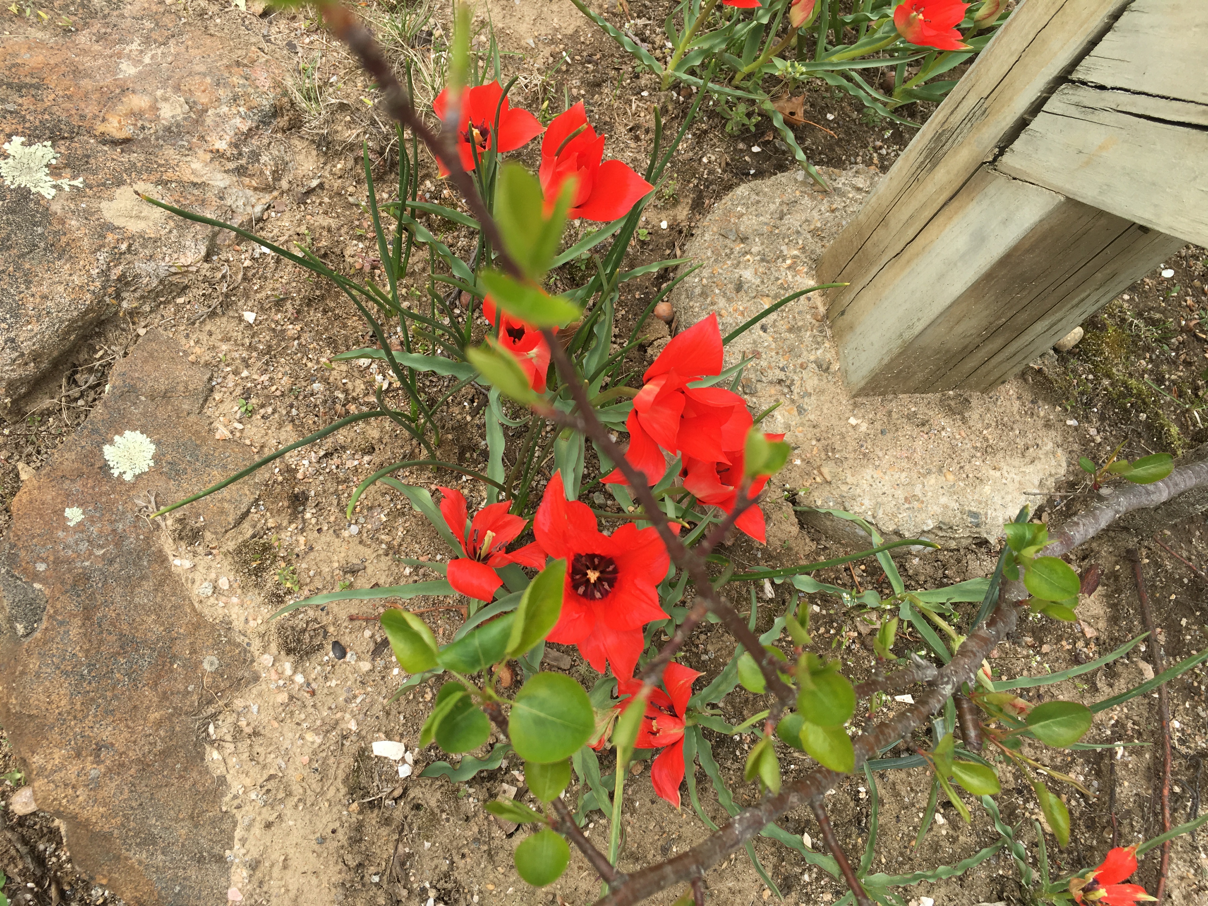 This very red species tulip, linifolia, dates all the way back to 1884, according to the catalog. I planted it in the small bed around my mailbox. It’s much shorter than Cynthia, about 6 inches tall, so a good choice for small spaces. Linifolia is also known for naturalizing.