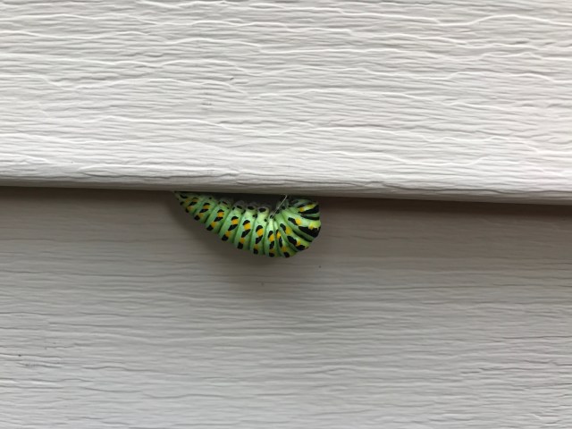 Two days after writing my last post about the black swallowtail caterpillar that came home with me on some fennel, I went outside and the caterpillar was gone. I looked through the fennel plant, and in nearby shrubs, but it had disappeared. Later, as I was getting into my car, I just happened to glance at the side of our house and there it was.