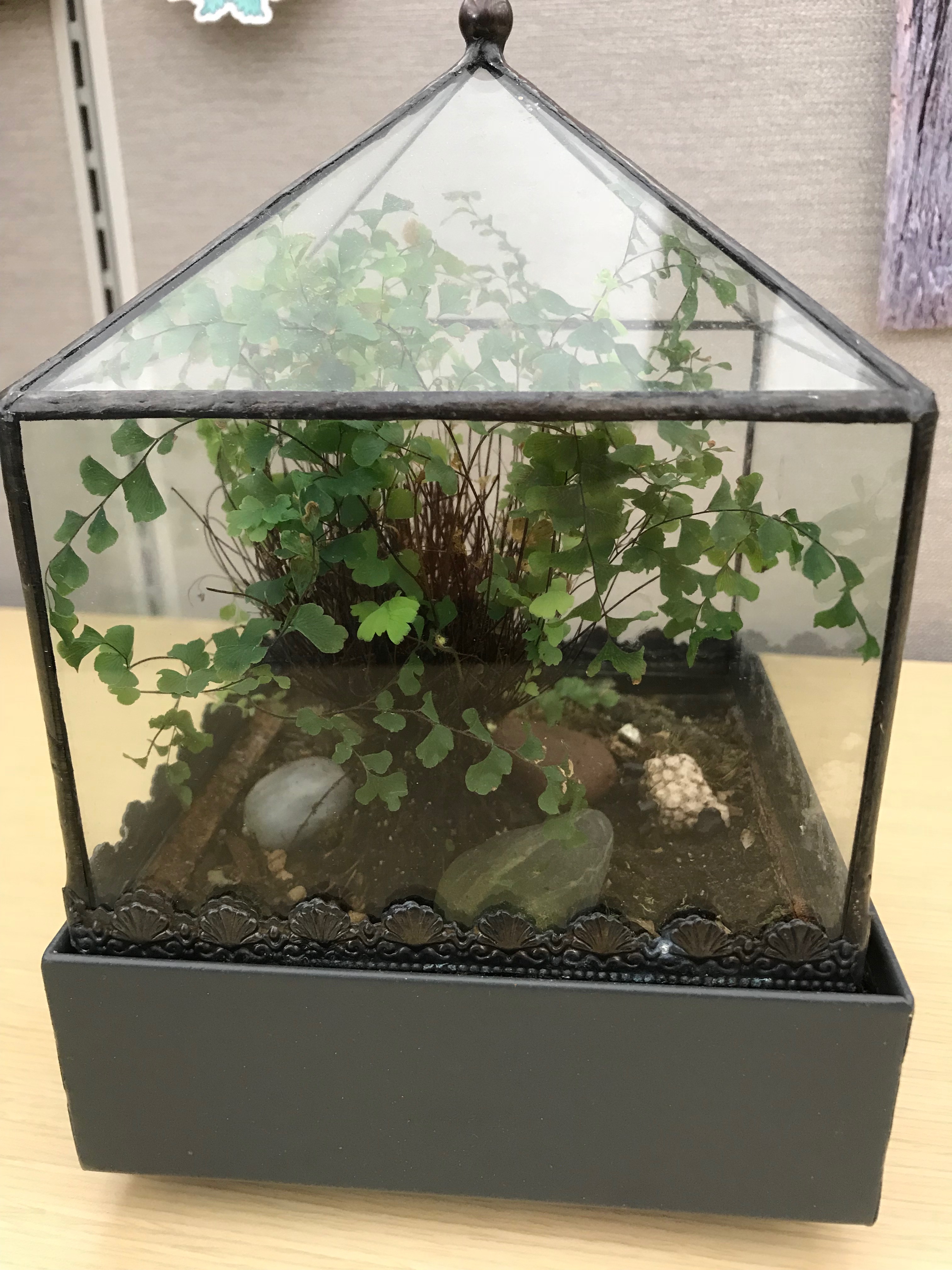 The maidenhair fern growing inside is the sole inhabitant. There isn’t room for anything else, except for a couple of pebbles and a miniature sheep – the small white thing perched on a stone. The entire terrarium is only about eight inches wide.