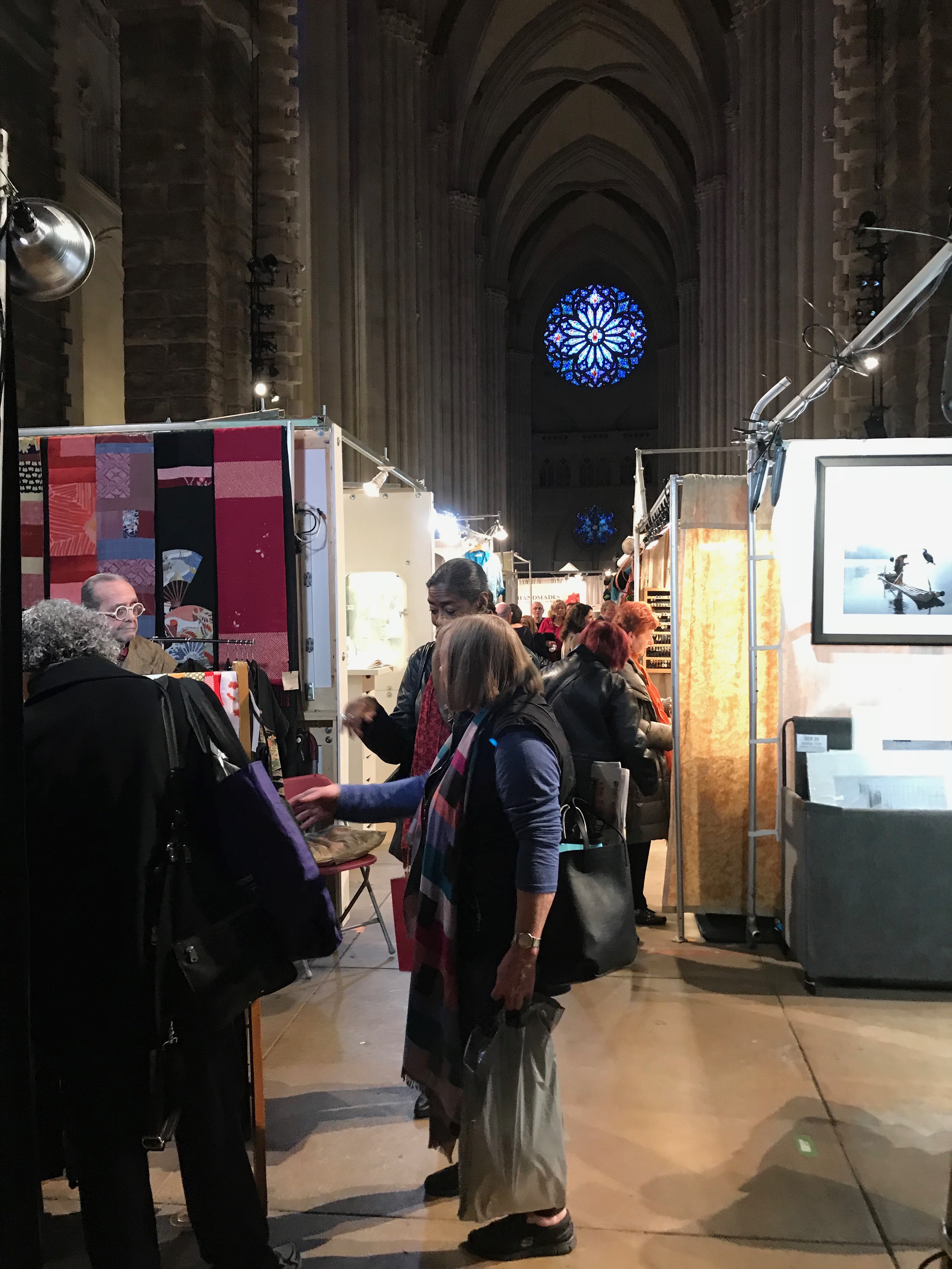Shoppers browsed, glancing up occasionally at the soaring vaulted ceiling and the stained glass windows, which are numerous and awesome.