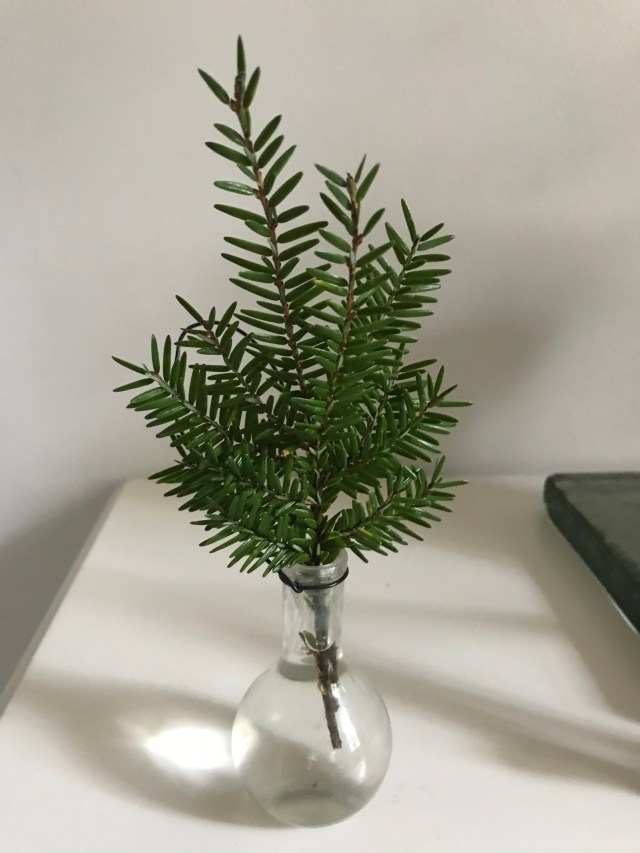 This sprig of hemlock is the last remnant of my Christmas decorations. It looked so cute in its tiny vase that I couldn’t bear to put it on the compost pile. Then I got to thinking about how plants brighten my home indoors at this time of year and how much they enhance my daily life.