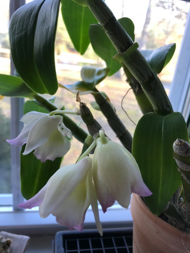 This orchid is Dendrobium “Snow King.” The flowers are now opening. That’s a humidity tray it’s sitting on. I keep my windowsill orchids on them all year long, but I fill the trays with water in the winter. The plants seem to appreciate it.