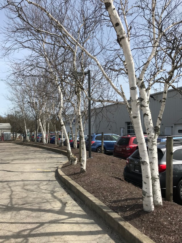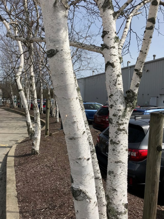 I have been watching this line of white birch trees for years. Most people would probably never give them a second look, but to a tree geek like me they are a marvel, because they shouldn’t be doing so well in a narrow strip, sandwiched between a car dealer and a gas station.