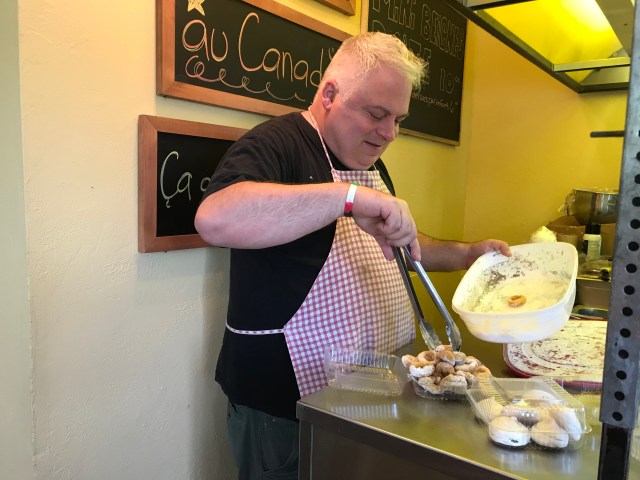 Here are our doughnuts being finished in powdered sugar, or as they say in Canada and the rest of the Commonweath, “icing sugar.” He allowed them to cool for a few minutes before dusting them, but they were still a bit warm when we had our first bite. Ecstatic eye-rolling ensued.