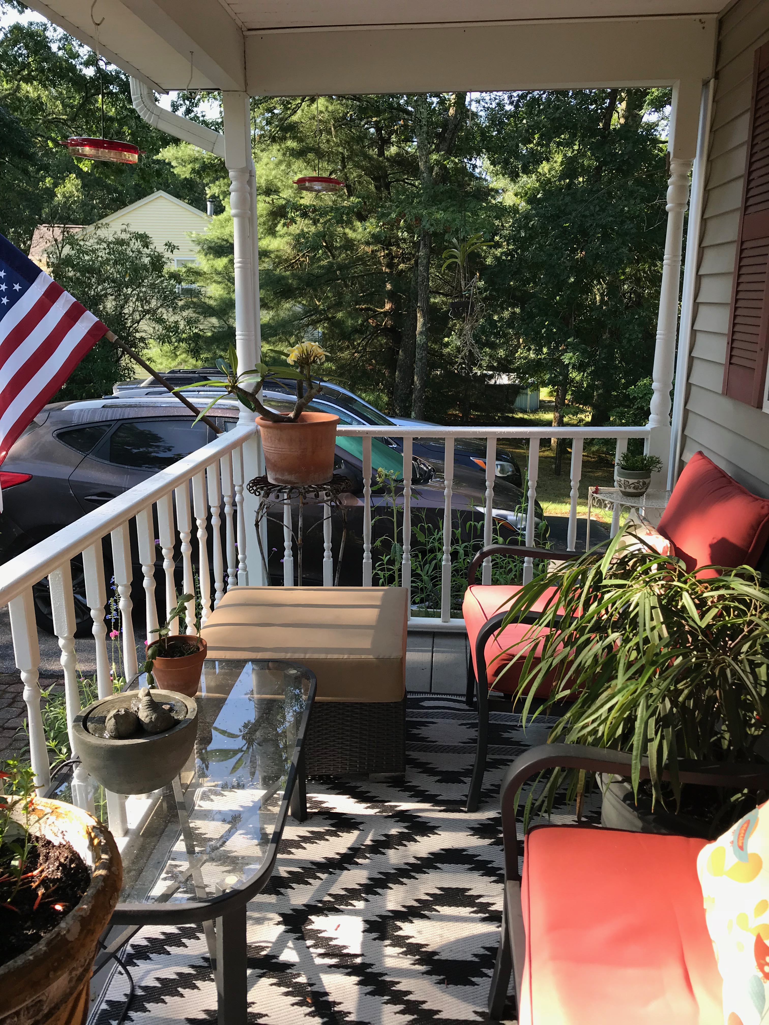 When we bought this house a couple of years ago, the covered front porch was bare. I wondered how and even if we would use it, and now, this is where I spend much of my free time during the summer. As you can see, it isn’t a large space, but it’s a very pleasant place to sit and listen to the tree frogs and the owls and the whippoorwills.