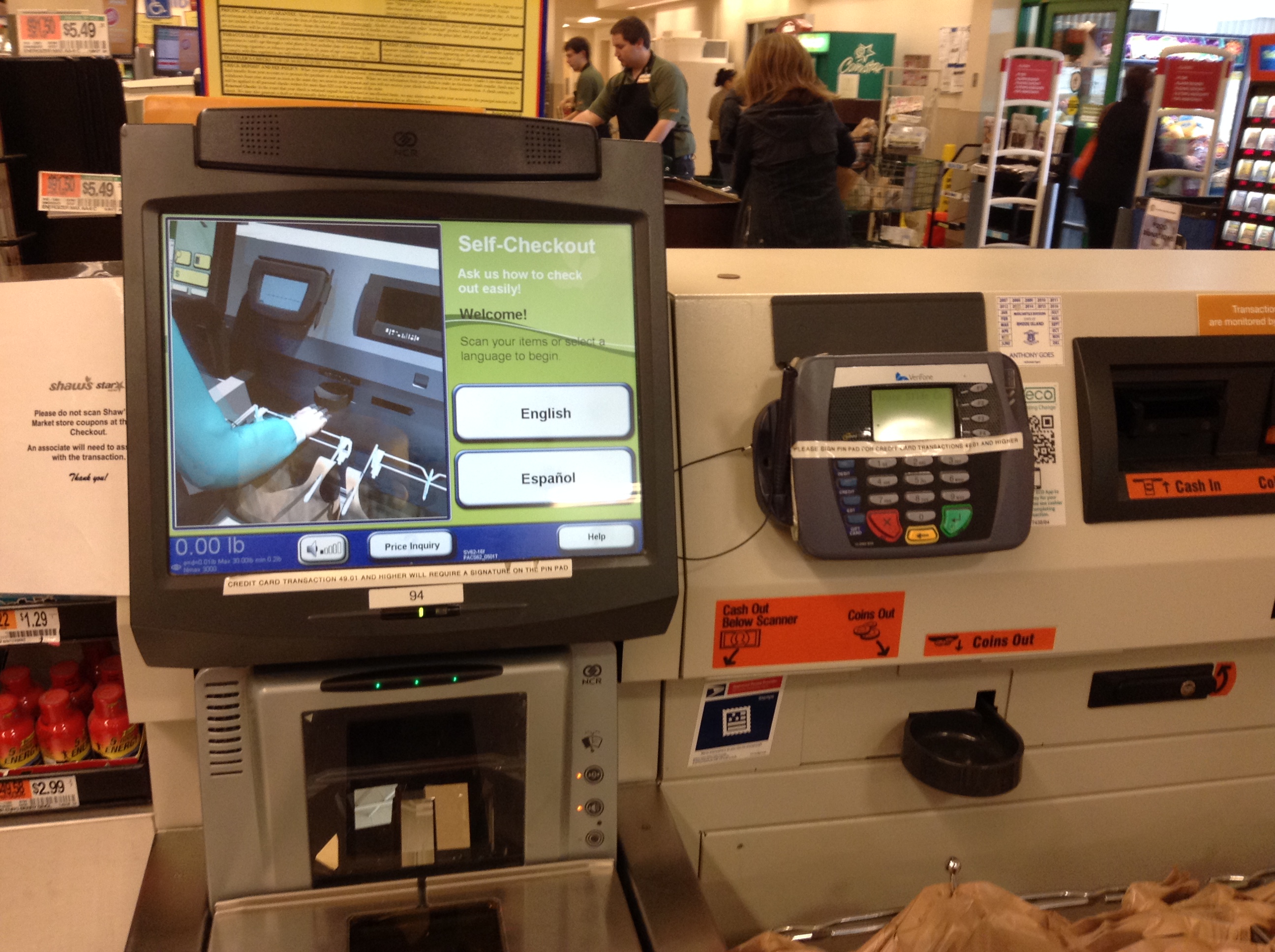My local supermarket has had these self check-out things for a while. I don’t usually use them because: a) I like the people who work at the regular check-outs and I want them to keep their jobs, and b) the self check-outs never work the way they’re supposed to.